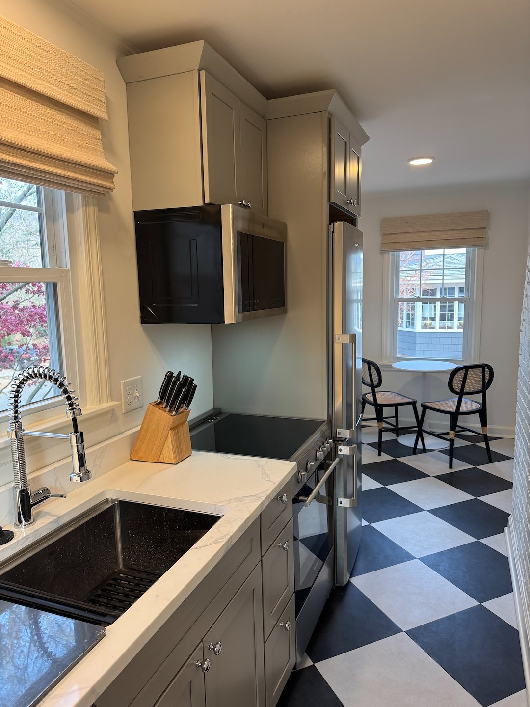 Throughout both rooms we installed new fixtures and finishes to create a cohesive look. The stone countertops in the kitchen work well with the updated cabinets and the new flooring, and the bathroom fixtures coordinate with the tiled shower for a consistent feel. All painted surfaces were newly painted to freshen the space and tie the finishes together.